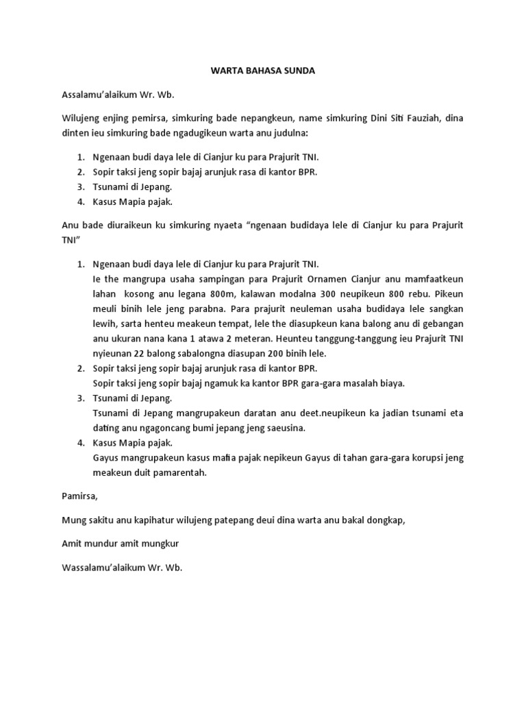 3 contoh teks warta basa sunda. Warta Bahasa Sunda Info Kesehatan Kulit Dan Kosmetik. Dina poe ahad nu geus kaliwat di kampung manggis hilir tepatna tabuh 10 enjing parantos aya hiji kajadian anu ngahebohkeun warga salembur ku sabab ayana longsor dicaket pasawahan warga tina kajadian ieu1 warga pupus.
