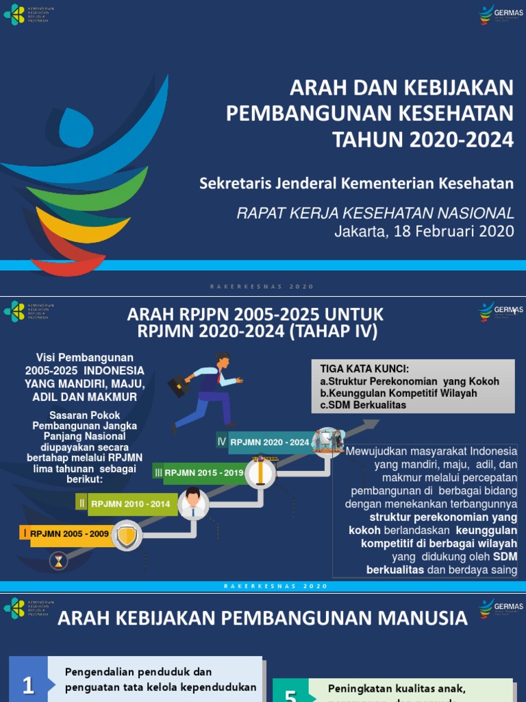 Pembangunan kesehatan dalam RPJMN 2020 2024. Pemerintah Kabinet Indonesia Maju telah menetapkan Rencana Pembangunan Jangka Menengah Nasional RPJMN Bidang Kesehatan Tahun 2020-2024 yakni meningkatkan pelayanan kesehatan menuju cakupan kesehatan semesta melalui penguatan pelayanan kesehatan dasar Primary Health Care dengan mendorong peningkatan upaya promotif dan preventif didukung. 4-9 Jakarta Selatan 12950 Halo Kemkes 1500567 Pengunjung hari ini.