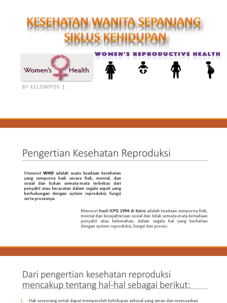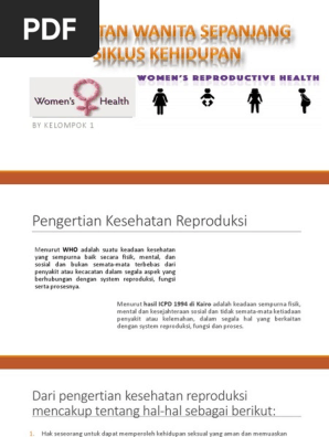 Masalah yang mungkin terjadi pada tahap ini. Pendekatan yang diterapkan dalam menguraikan ruang lingkup Kesehatan Reproduksi adalah pendekatan siklus hidup yang berarti memperhatikan kekhususan kebutuhan penannganan sistem reproduksi pada setiap fase kehidupan serta kesinambungan antar fase kehidupan tersebut. KESEHATAN WANITA SEPANJANG SIKLUS KEHIDUPAN Author.